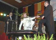 Bürgerpreisvergabe 2006 Das Publikum in der vollbesetzten Turnhalle der Albrecht-von-Eyb Grundschule in Burgoberbach erlebte einen bunten Galaabend mit Unterhaltung, Tanz und viel Musik. Das Herrieder Christkind Selina Dittrich wurde gar verzaubert. Die beiden Moderatoren Roland Walter und Helmut Erl führten Gäste wie Preisträger auf humorvolle Art durch den Abend. Ihre eigenen Showeinlagen wurden ergänzt durch Auftritte der Band First Generation unter der Leitung von Petra Horndasch und Gesangseinlagen des Chores Querbeet unter Dirigentin Birgit Heinrich. Der Freundeskreis Theater und Kultur präsentierte zudem unter der Leitung von Liane Heller ein Medley berühmter Musicals.
